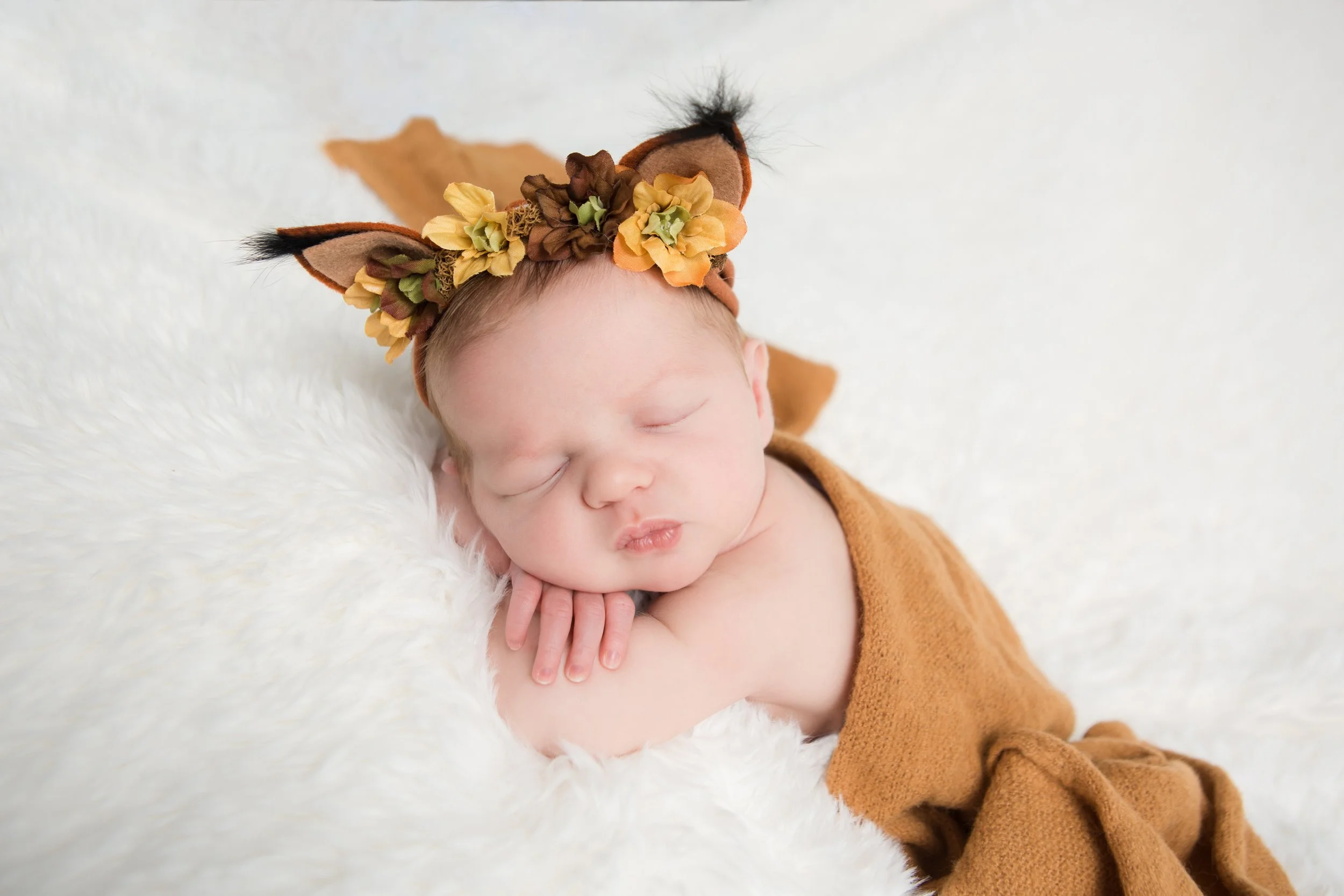 A sleeping baby dressed in a brown outfit, lying on a white furry surface, wearing a decorative headband with brown and yellow flowers and animal ears.