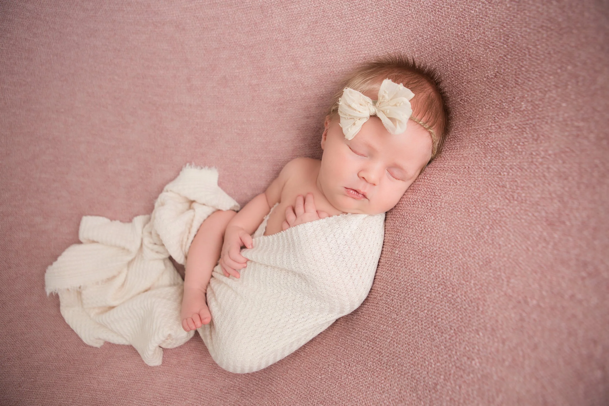 Peacefully sleeping newborn baby girl with a cream bow in her hair, wrapped in a soft cream blanket, lying on a pink textured surface.