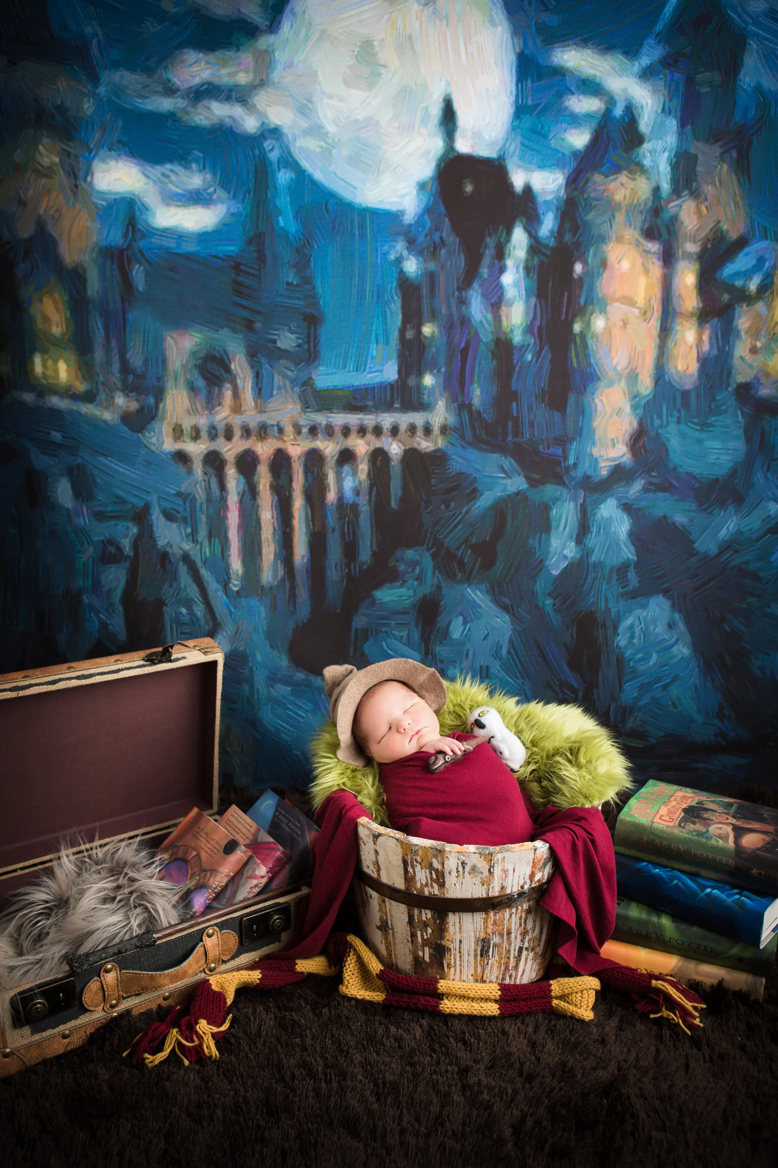 A sleeping baby in a cozy setting with Harry Potter books, plush toys, and a suitcase, in front of a painted mural of Hogwarts castle from Harry Potter.
