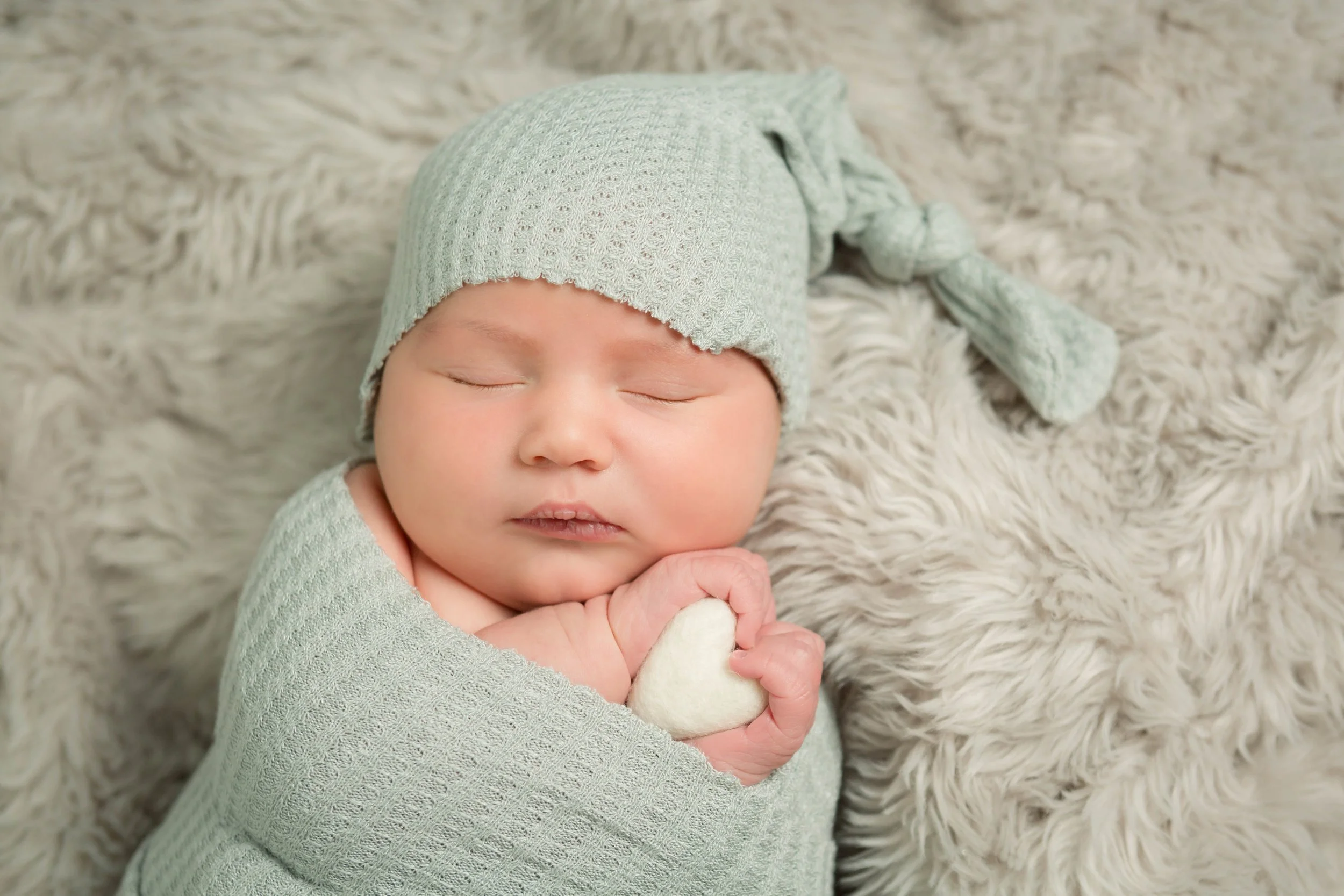 A sleeping baby wrapped in a soft green blanket, wearing a matching green knit hat with a tied knot, resting on a fluffy cream-colored rug, holding a small white heart-shaped object.