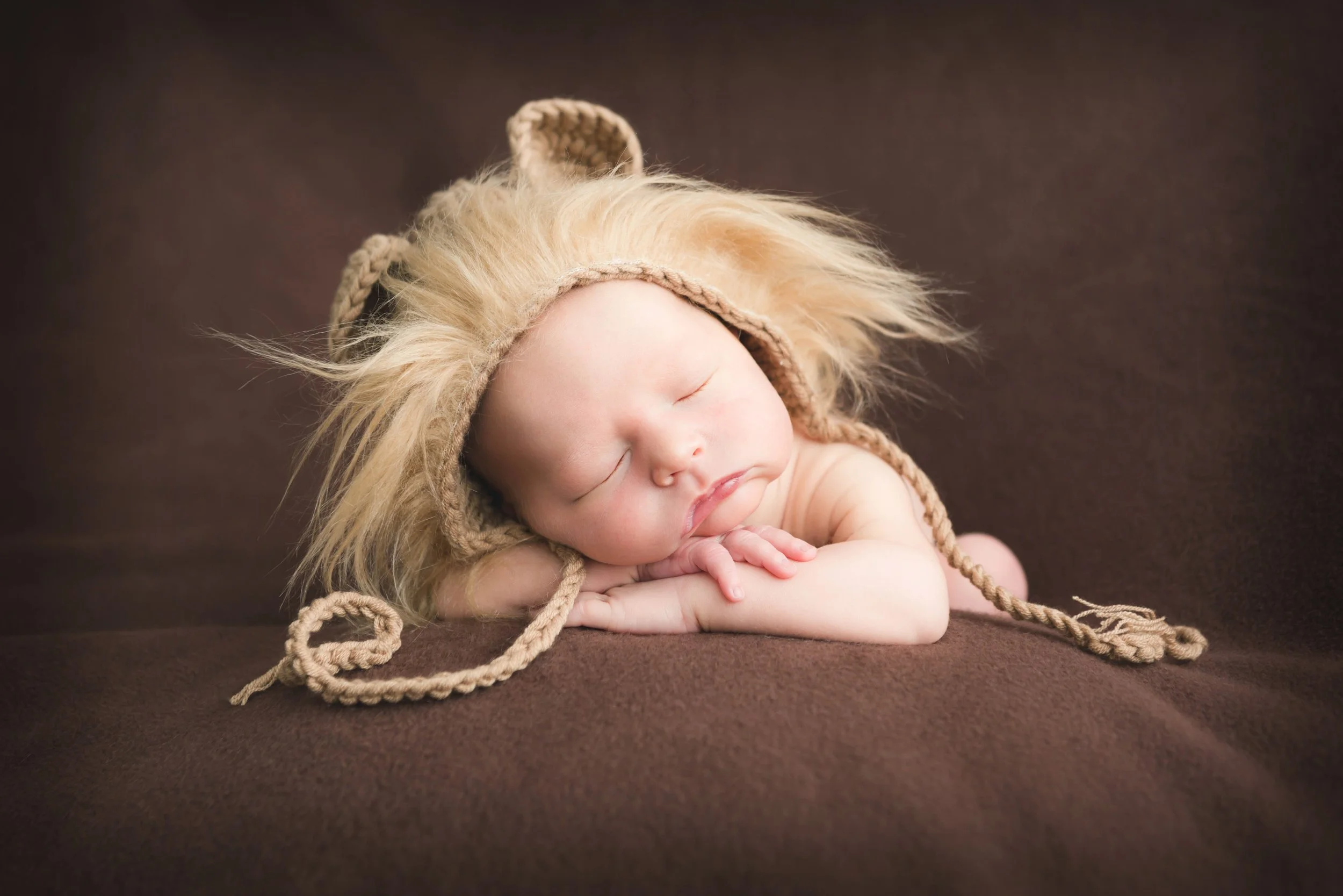A sleeping newborn baby wearing a lion costume hat with a brown background.
