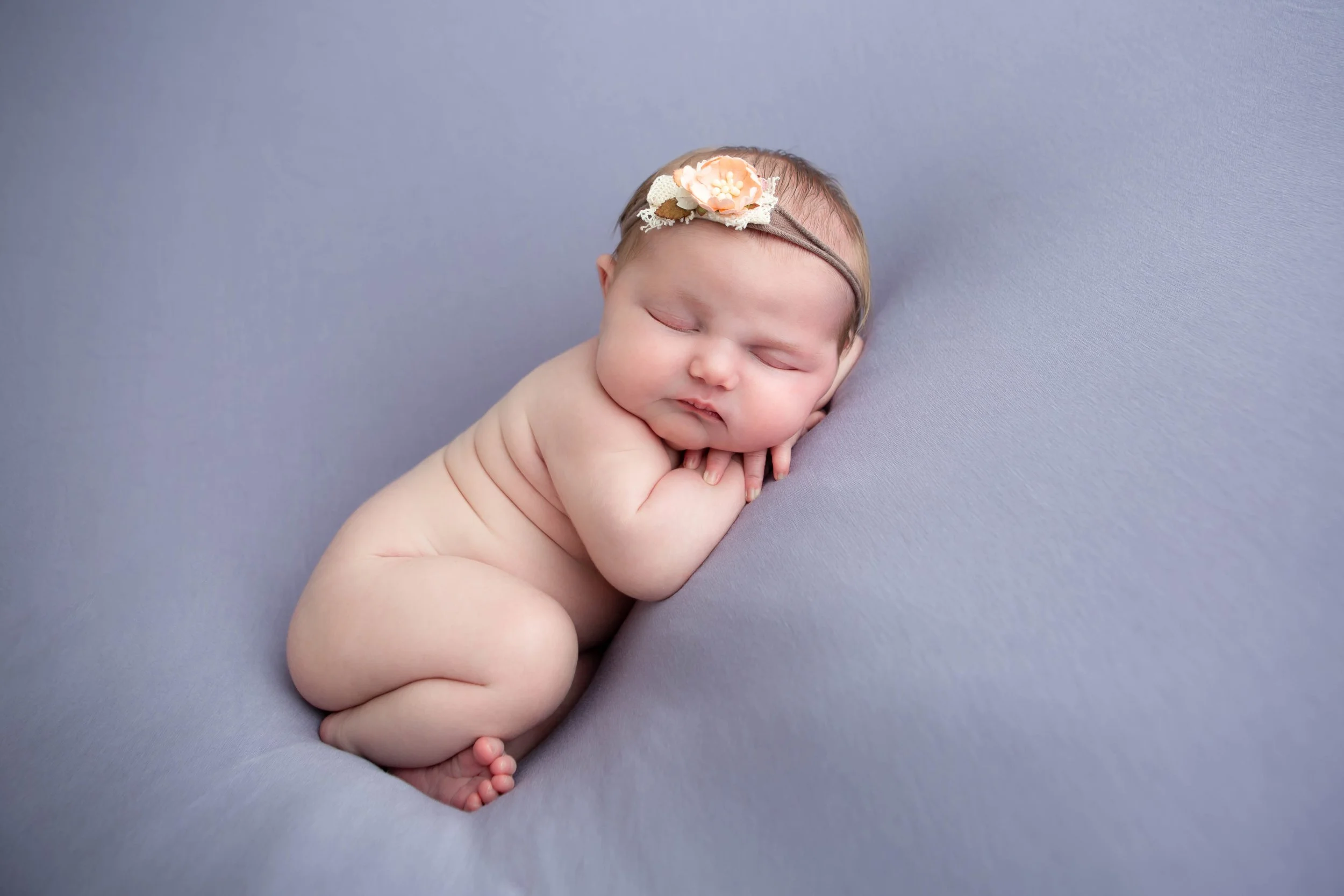 A sleeping, naked baby curled up on a soft purple surface, wearing a floral headband.