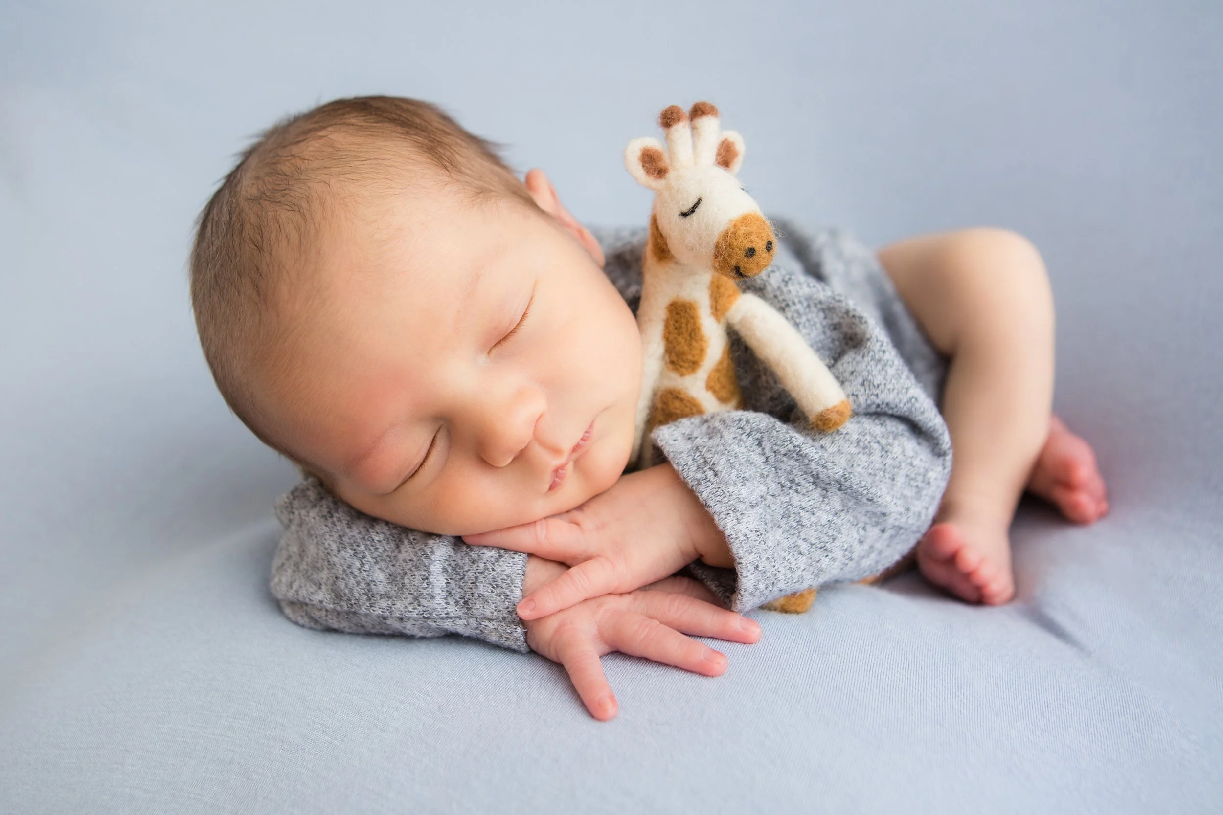 A sleeping baby with a plush giraffe toy lying on a soft, light blue surface.
