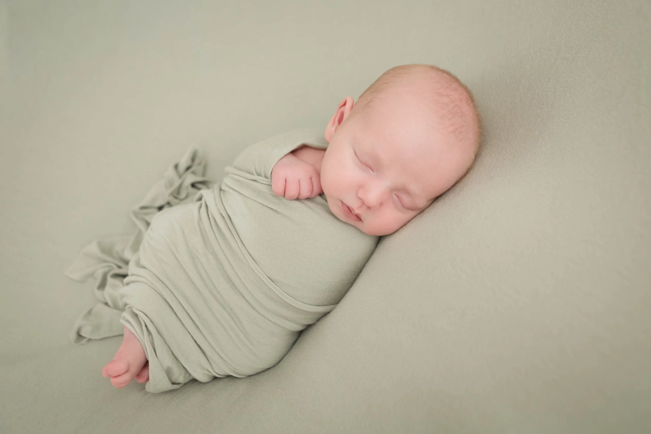 A newborn baby sleeping peacefully, wrapped in a light green blanket, on a matching green surface.